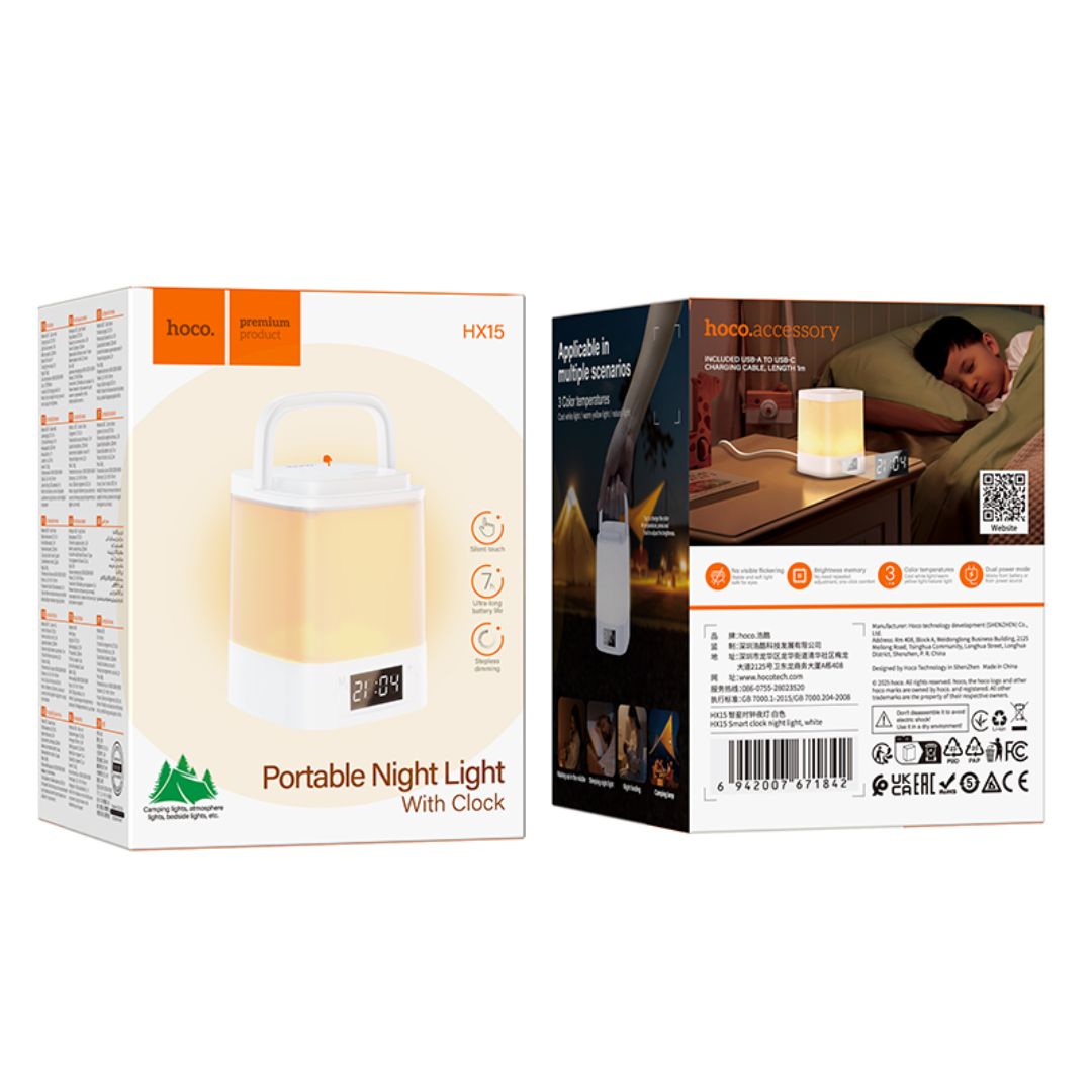 Lámpara LED recargable Hoco HX15 con reloj digital, 3 tonos de luz, control táctil y carga USB-C. Ideal para dormitorio, escritorio, lectura, luz de noche y uso portátil en interiores o exteriores.